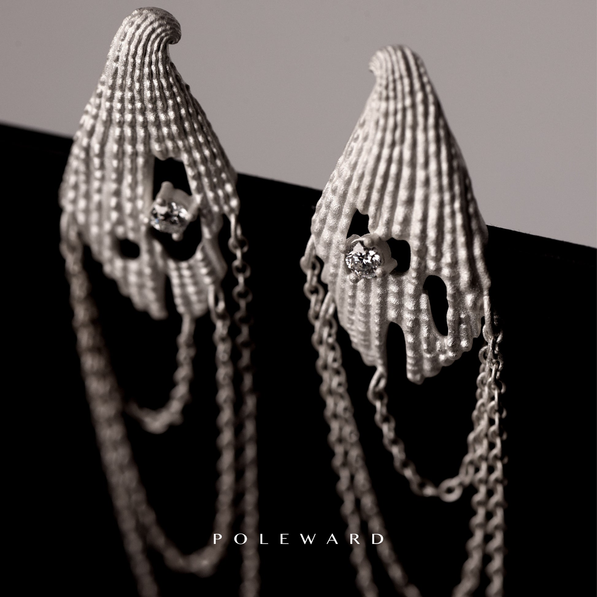 The form is drawn from ocean-worn shell crevices, using irregular, fragmented lines to shape the earrings’ core. It feels as though the tides have etched the passage of time into the silver surface.