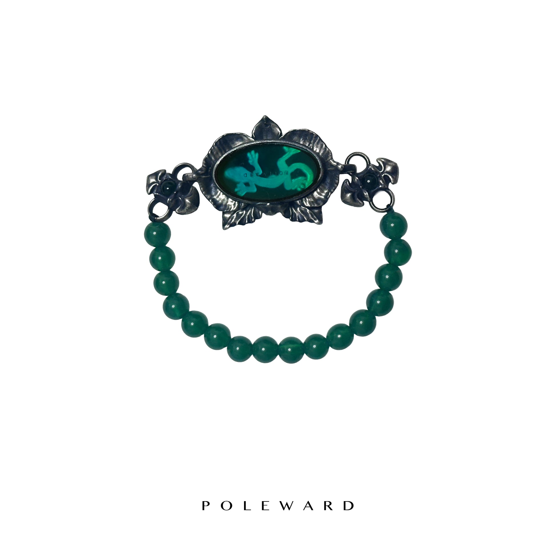 Unlike the chain version, this bracelet is strung with polished green agate beads, grounding the design in weight and continuity. The agate’s smooth density echoes stone and earth, adding quiet gravity beneath the luminous centerpiece.